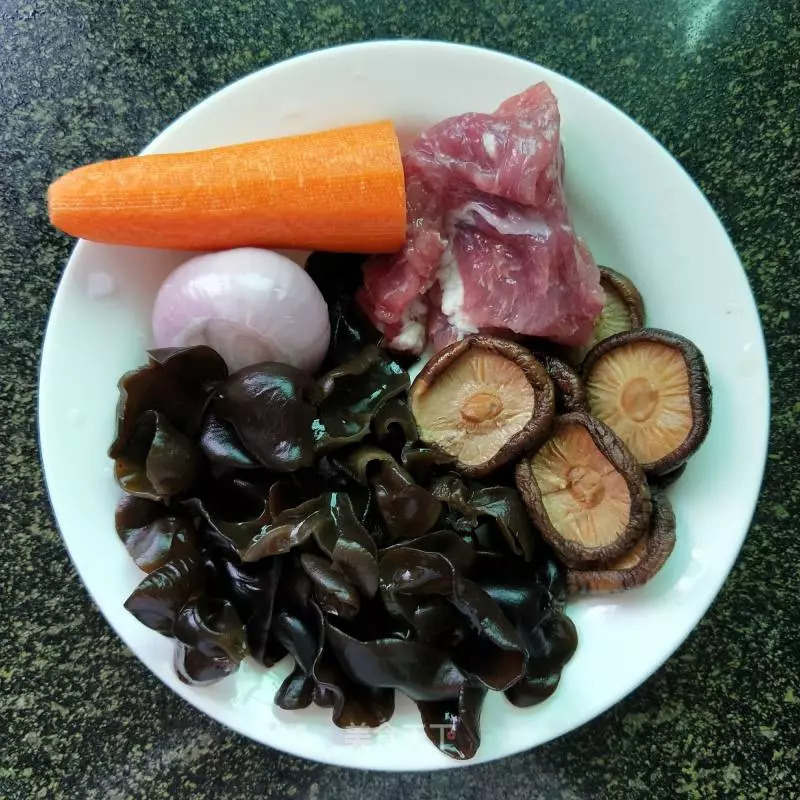 1. 材料:肉、香菇、木耳、葱头、胡萝卜。