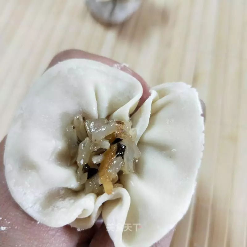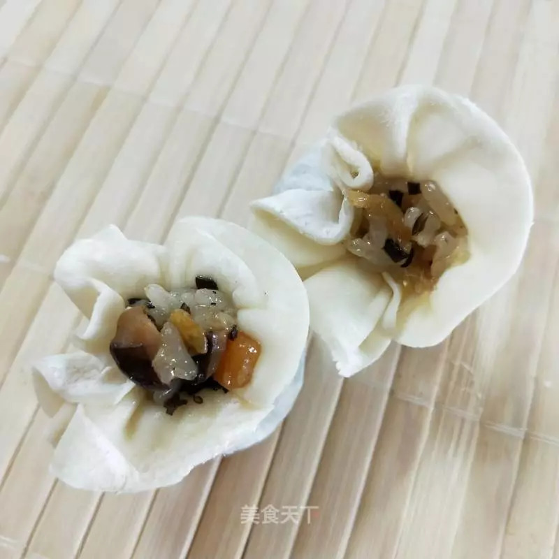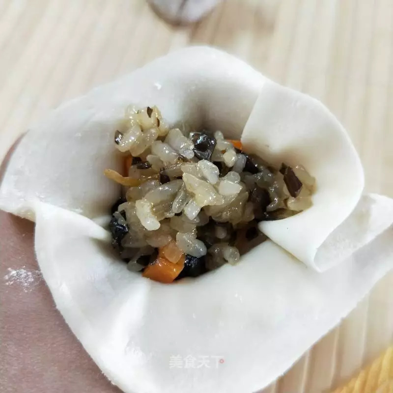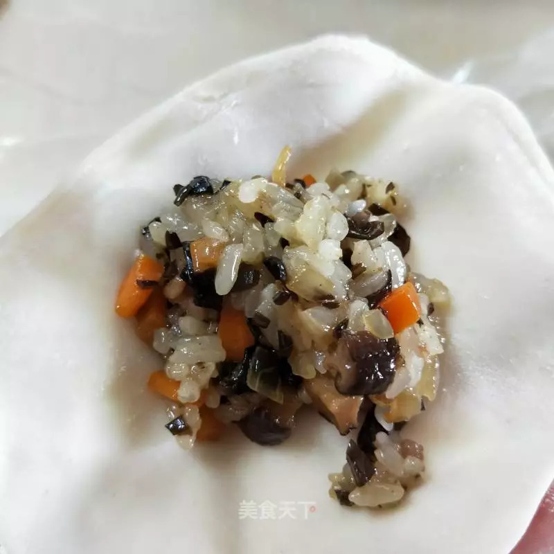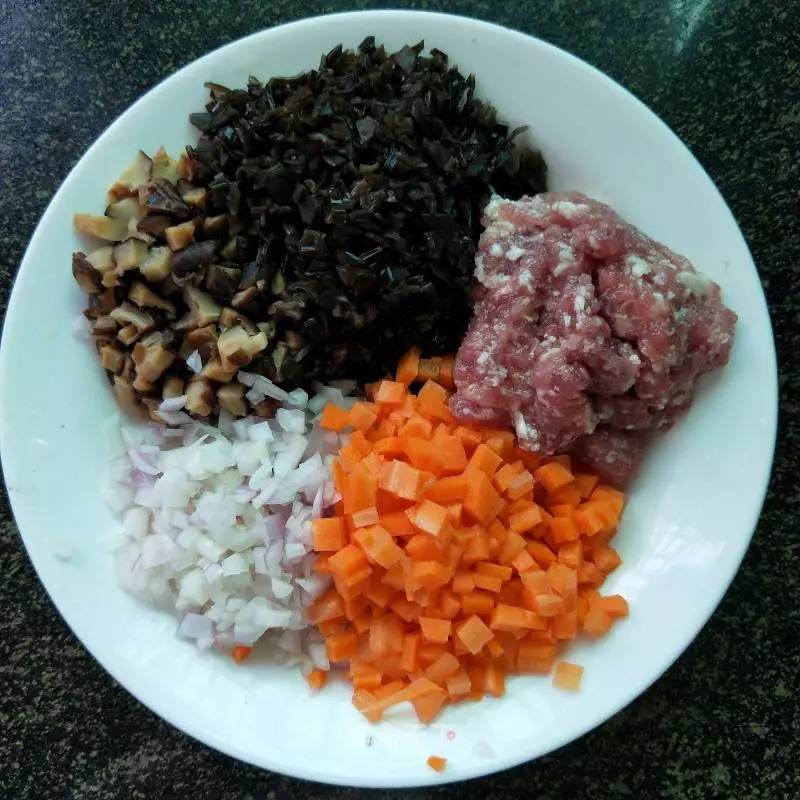 糯米150g肉90g泡发木耳80g香菇6颗胡萝卜半根葱头1个饺子皮300g虾皮5g盐少许鱼露适量酱油适量鸡精少许