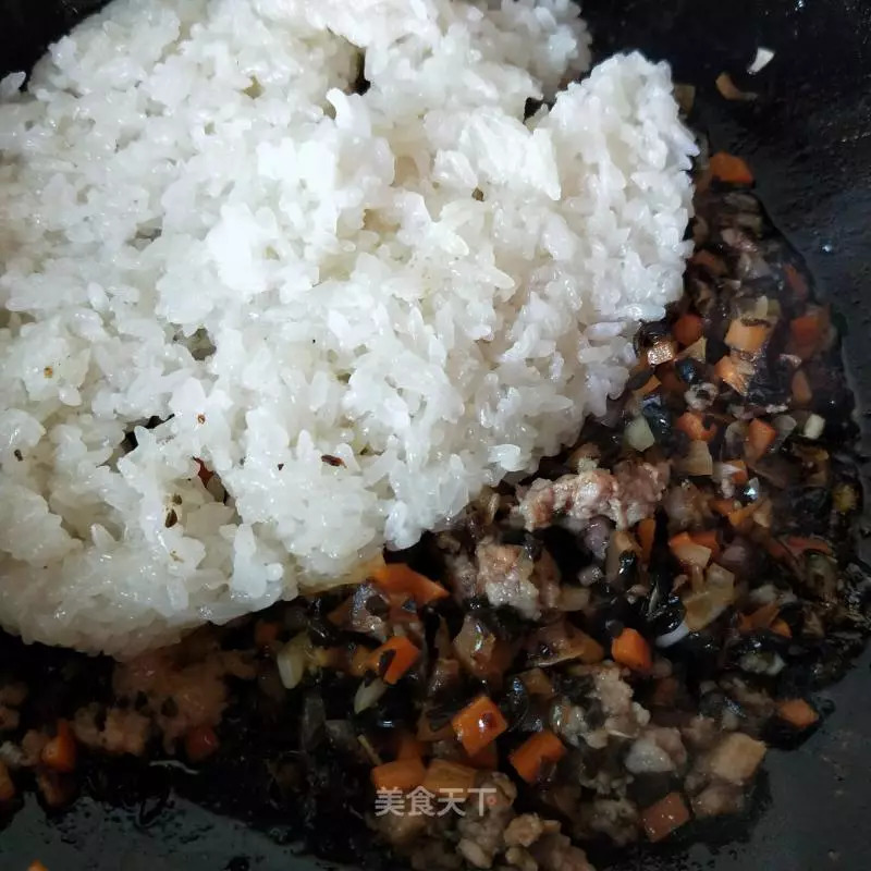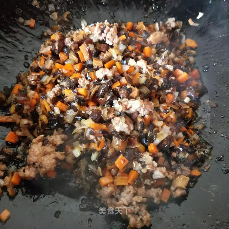 6. 依次放入:葱粒、肉、香菇、木耳、胡萝卜炒香,加入鱼露、酱油、少许盐和鸡精。