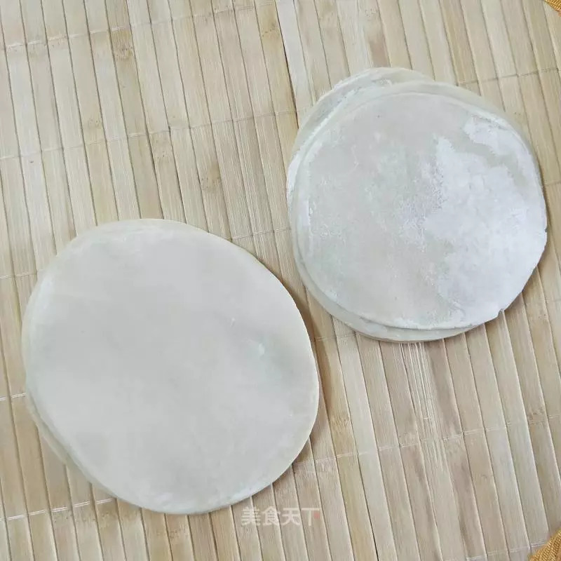 9. 准备300克饺子皮,用手掌压一下,皮更薄更大些,包得花漂亮些。