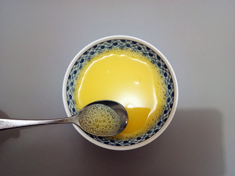 做法3、鸡蛋打入碗中,加入和温水打散,并撇去浮沫。(水和鸡蛋的比例为1.2:1)