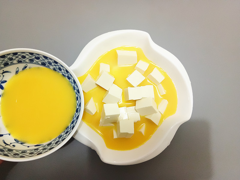 做法5、撇去浮沫的鸡蛋液从一边倒入豆腐中。