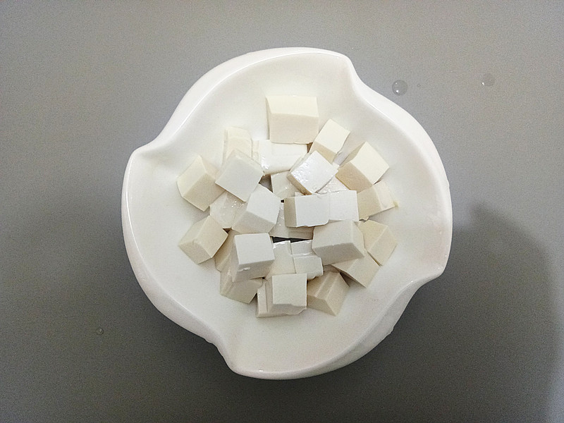 做法4、豆腐取出切块,放入深一些的容器中。