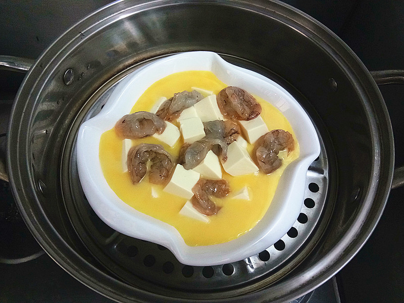 做法7、蒸制8分钟左右,蛋液稍稍凝固,揭开盖子放入腌渍好的虾仁,再次盖上盖子,继续小火蒸5分钟即可。