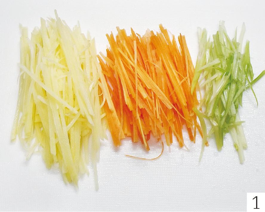土豆、胡萝卜分别去皮,切成2毫米粗细的丝。芹菜取茎,切细丝。