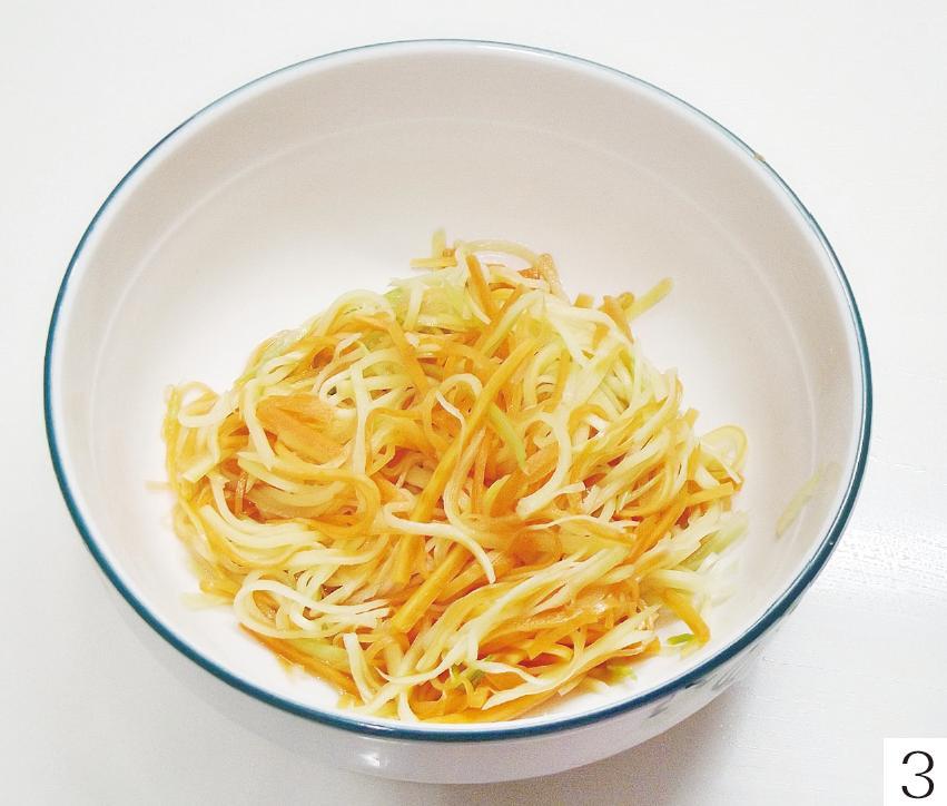 土豆丝、胡萝卜丝、芹菜丝放碗内, 加盐拌匀,放置腌制20分钟。