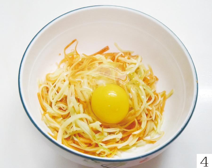 将一个鸡蛋打入菜丝内搅拌均匀。