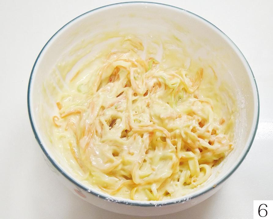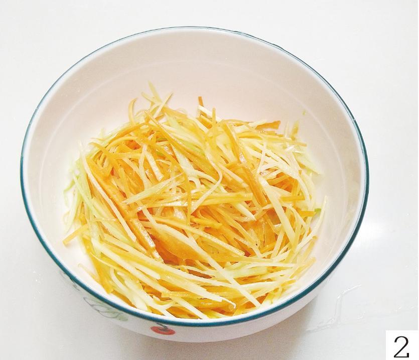 1.土豆和胡萝卜切丝的时候不要切太粗,不然不容易熟。切好的丝必须先用盐腌至变软,才好用来做饼。