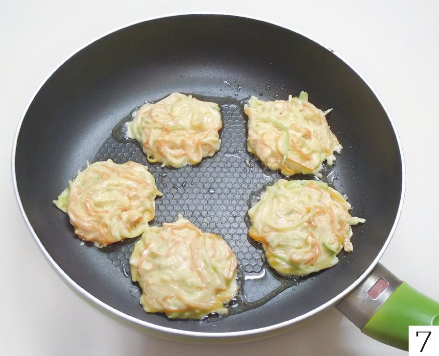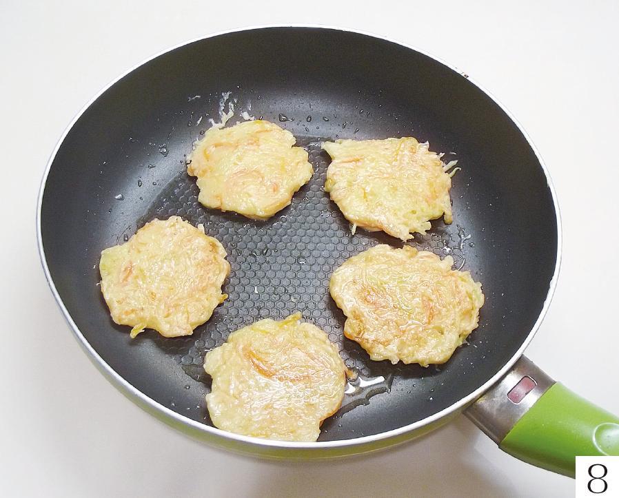 圆饼整好形状后开小火煎至定型,翻面,两面煎至表面金黄色即可。