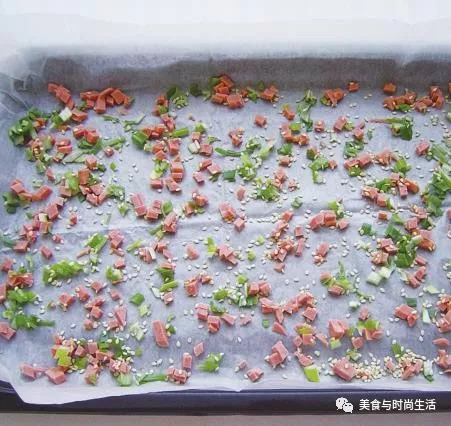 2 烤盘中铺好油纸,分别撒入火腿、葱末和芝麻仁。