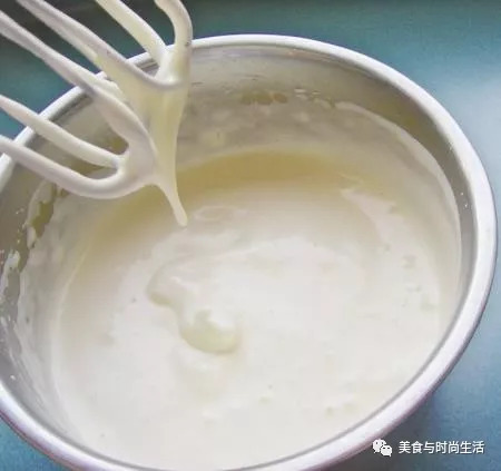 5 再用中速打至蛋液变成原体积5倍大,蛋糊可以画出纹路而不会立即消失。