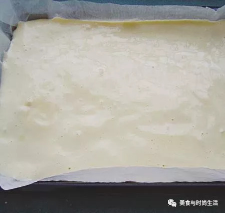 8 蛋糕糊倒入烤盘中,表面刮平,震出大泡。