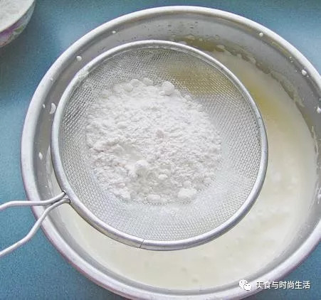 6 用筛子将低筋面粉筛入蛋液中,搅拌均匀。