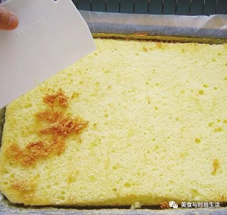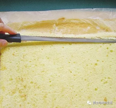 11 翻转蛋糕坯子,把表面上色的一层刮去。