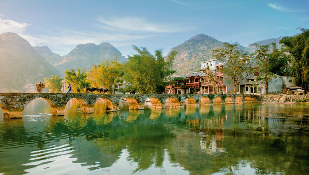这里有西南三大名泉之一的鹅泉,就在靖西城南约5公里的小鹅山麓,这座山形似一只鹅躺在泉水之上,故名鹅泉。鹅泉是德天瀑布的源头,它是一口峰林谷地中的上升泉,泉水往东宣泄成为鹅泉河。河上的这座古桥,建于清朝,保存较完好,长约60米,宽1.5米,全为石灰料石组成,是由15个涵洞的石拱桥组成。