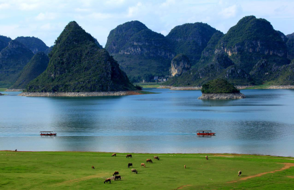 这里有个大型的喀斯特高原湖泊叫渠洋湖,位于靖西城北约28公里处,是百色市境内第二大人工湖,湖中有大小岛屿十多个,沿岸有海拔一千多米的岜行山,还有掩映在绿树翠竹当中的几百个壮族干栏式村寨,就像世外桃源般的美景。