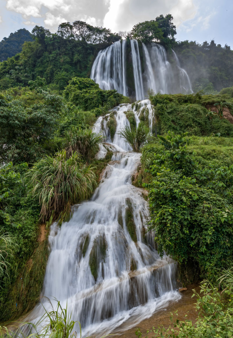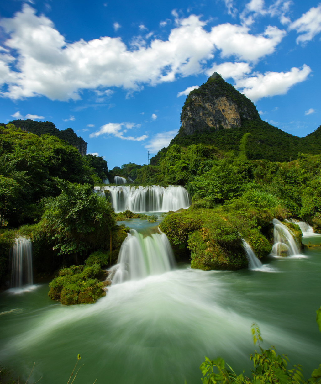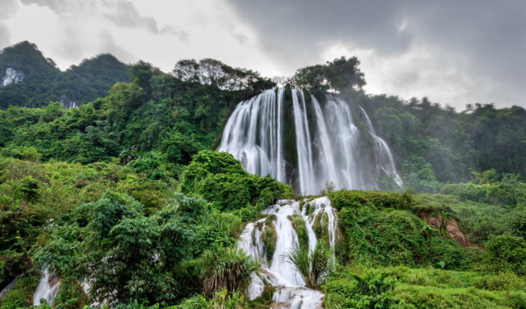 这里的瀑布最高约42米,最宽为50米,犹如巨大玉帘循崖而下,浪花飞溅,气势极为壮观。区内山峰如屏,河水如镜,瀑布沿流两岸林木葱郁,一派壮乡田园风光,景色迷人。