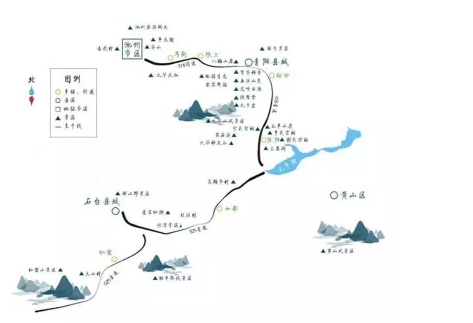 线路:池州城区→平天湖→齐山→九华天池→青阳县城→九华山→黄石溪→陵阳古镇→石台县城→秋浦河→仙寓山