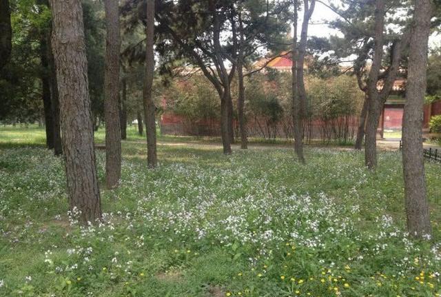图为传心殿东侧的小树林,草地里有着不知名的野花。