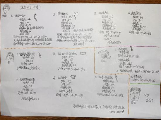 女儿果果认真的做了一下午,计算思路相当清晰:包括商品的预售价、定金、红包的折扣、最终的成交价,都列的清清楚楚,以此帮助她判断是否值得购买。这也更好的帮助了她判断,广告说明的是否是真实的优惠。