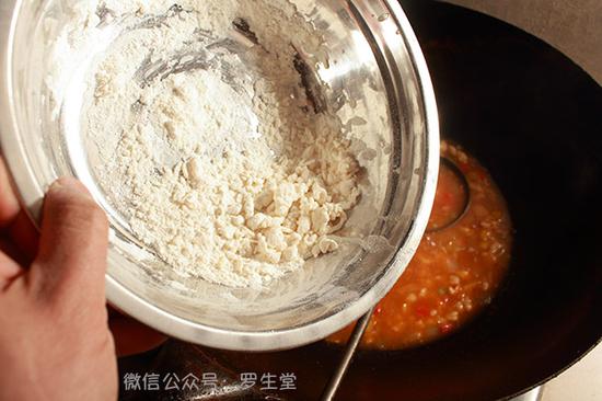 锅中倒适量开水烧开,把面粉用特别小的流水快速调出小疙瘩,倒进锅中大火煮开